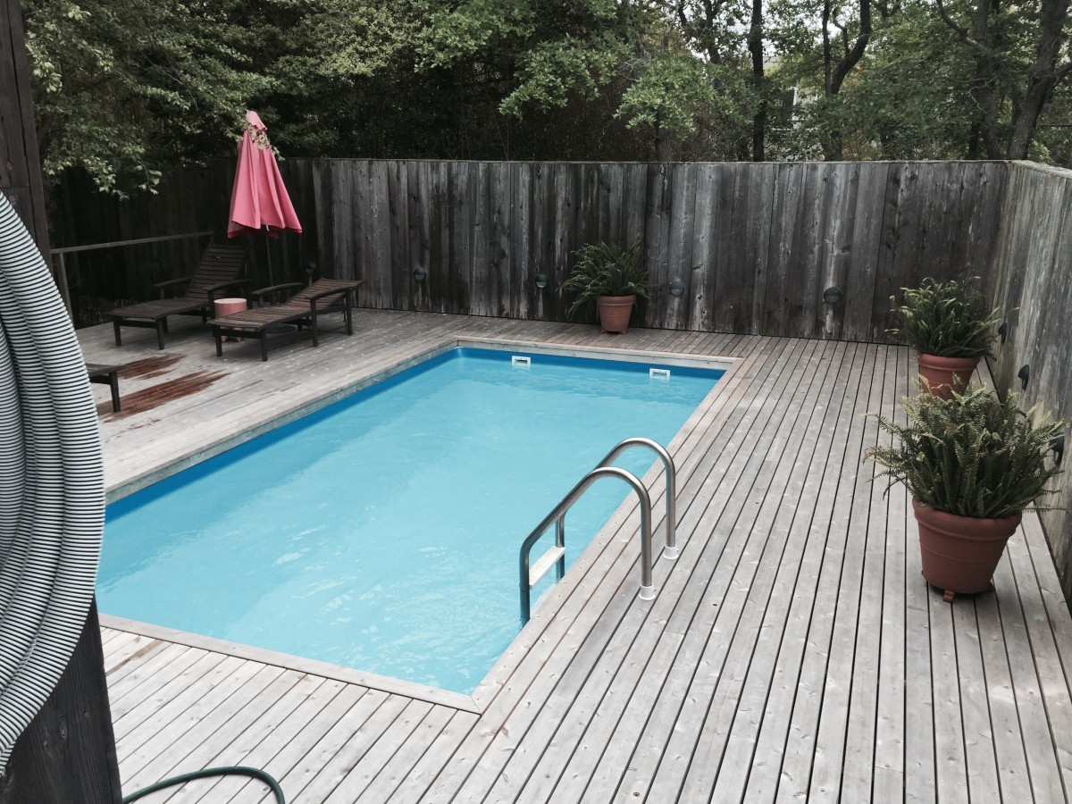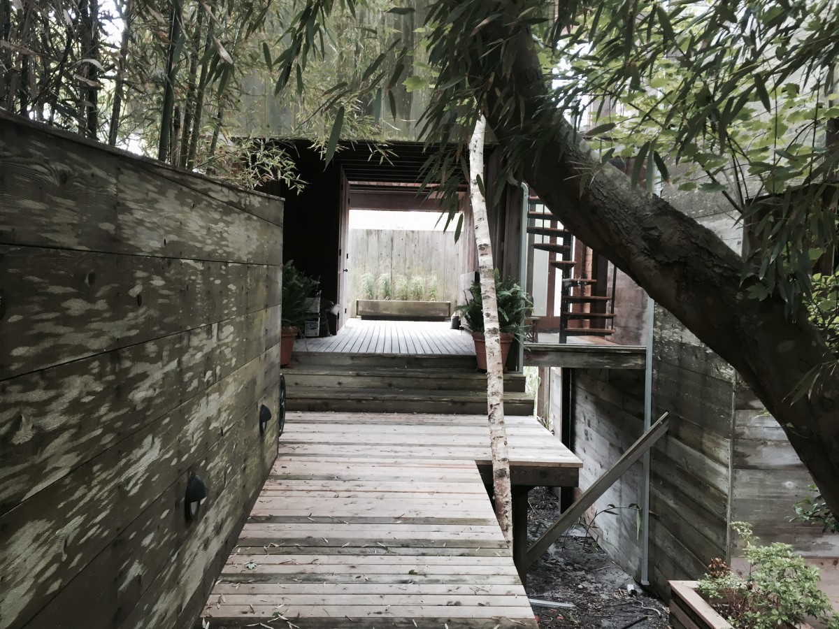 NEW FOR SUMMER 2017. Classic modernist home by Harry Bates. Privacy and bay views on a corner lot landscaped with pine and cypress. Open living/dining area with fireplace looks out onto treetop terrace with bay views. 4 bedroom, 2 baths, fully equipped kitchen and easily accessed roof deck. Charming pool and deck area.